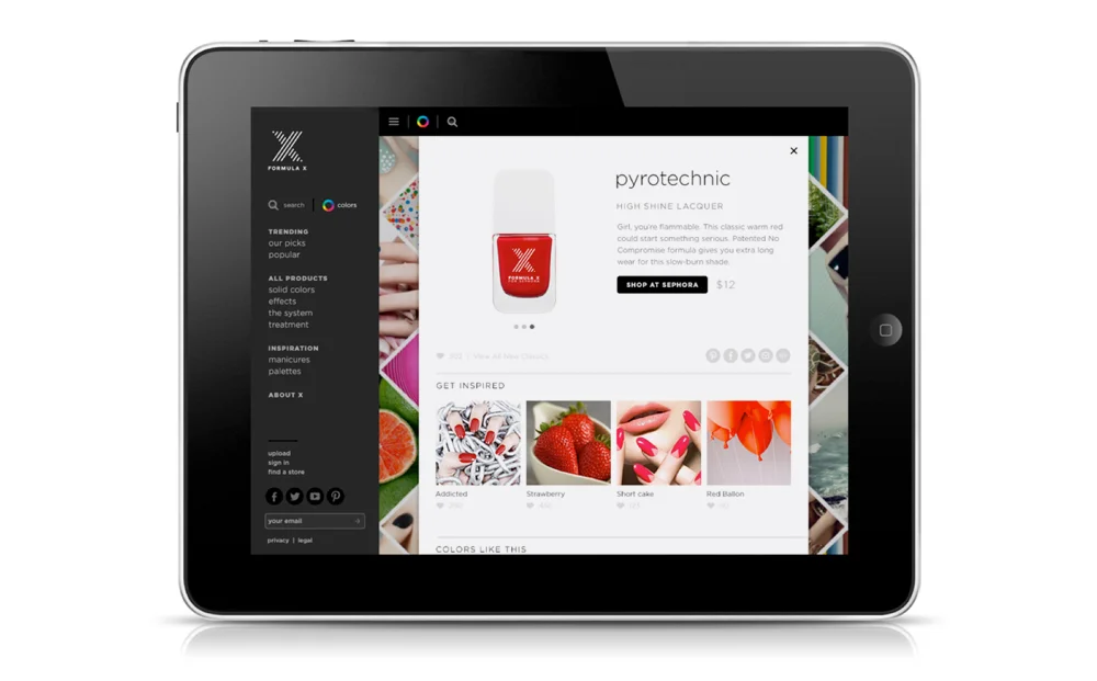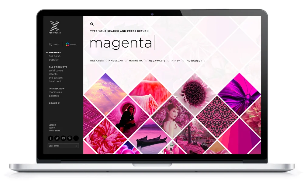 Sephora tasked us with concepting and executing a website for their new line of nail lacquers and effects, Formula X. We envisioned something far more than a showcase of shades–we created the first social hub for nail art enthusiasts. Inspiration was the driving force behind every creative decision, so product always went hand-in-hand with user-submitted mood imagery, color palettes, and manicures. Rather than the usual showcase of slick, retouched beauty photography, we assembled an endless grid of images that was richly tagged to make search functionality part of the fun. Start typing a color, a mood, an occasion, and the predictive text would show undreamed-of possibilities, so trains of thought could jump the tracks from crimson to ruby slippers to gutsy.